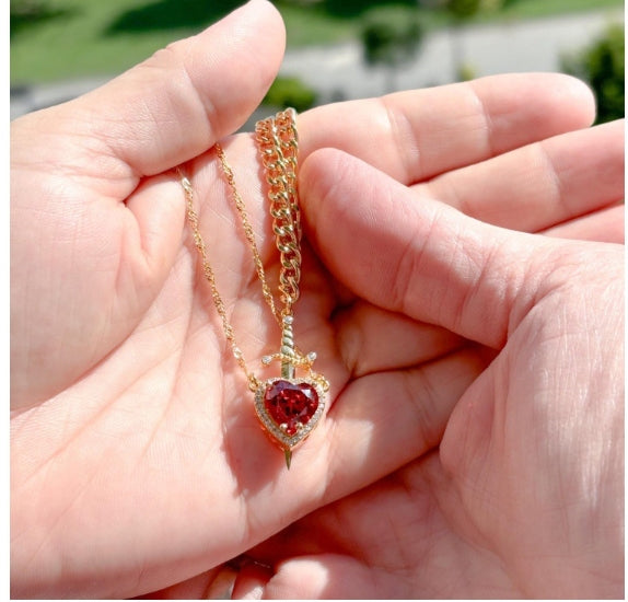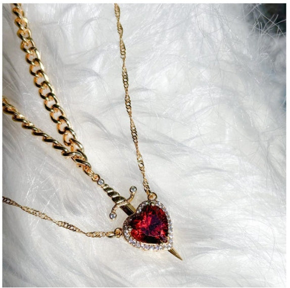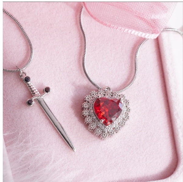 红色水晶爱心匕首吊坠分层项链